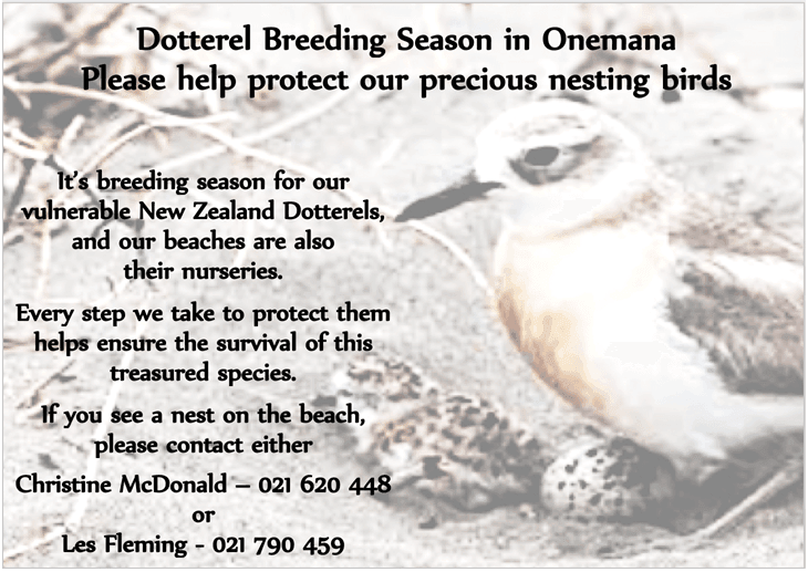 It's Dotterel season again - please take care walking on our beach, and if you see a nest please contact either Christine 021 620 448 or Les 021 790 459 who will help protect the nest.